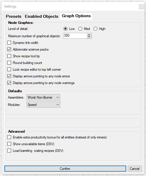 This is where you can set which buildings / recipes are to be enabled for your graph. Rather handy if you wish to plan for a specific science tier. Each building/recipe can be set manually by searching for it and enabling/disabling it, by loading a save file, or by selecting which science packs you wish to have available (any technology with the required science packs will be researched).