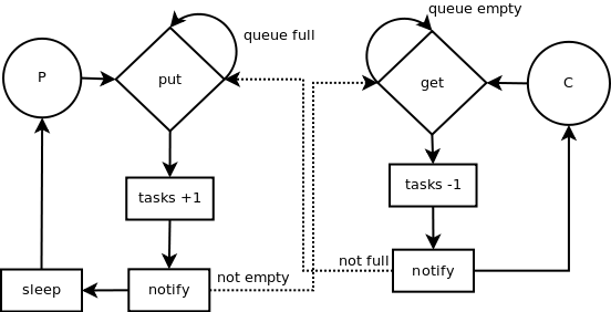 The put() method adds an item or waits if the queue is full. It notifies the threads blocked on get() that the queue is not empty. See above for an explanation on the Condition object for more details.