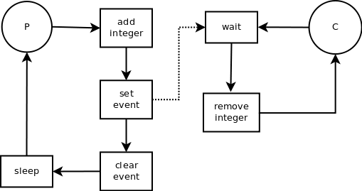 Next is the consumer class. We also pass an Event instance to the constructor. The consumer instance is blocking on wait() until the event is set indicating that there is an integer to consume.