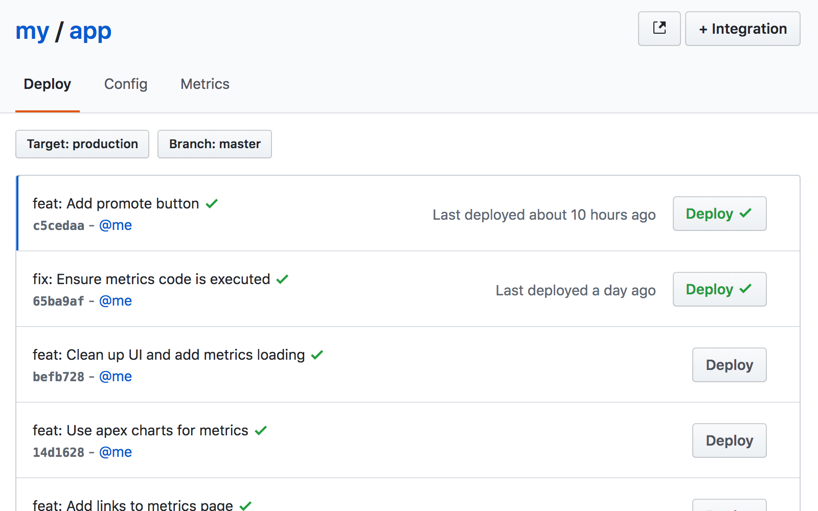 - Click to deploy: Click the latest commit in the Deliverybot dashboard to deploy your code. It doesn't get any simpler than that.