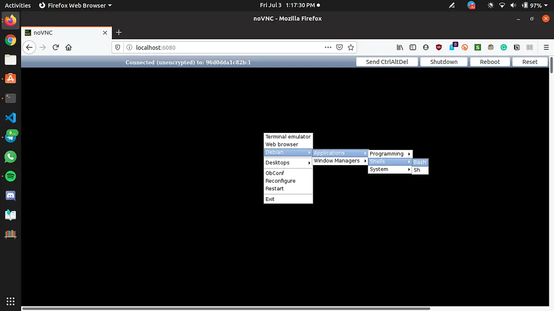 sudo docker run -d -t -i -p 6080:6080 apsychogirll/kalibrowserb. Checkout the address http://localhost:6080 and you’ll see a working kali container UI.