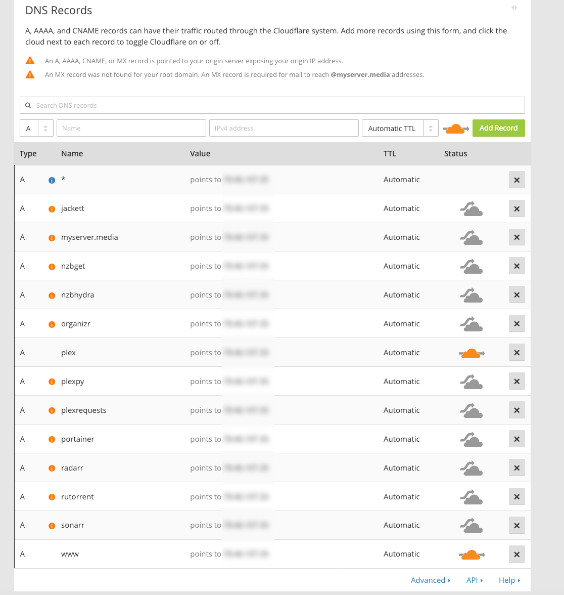 *andwww. Set Plex subdomain toDNS and HTTP proxy (CDN)(click the cloud icon). Leave the others off. -