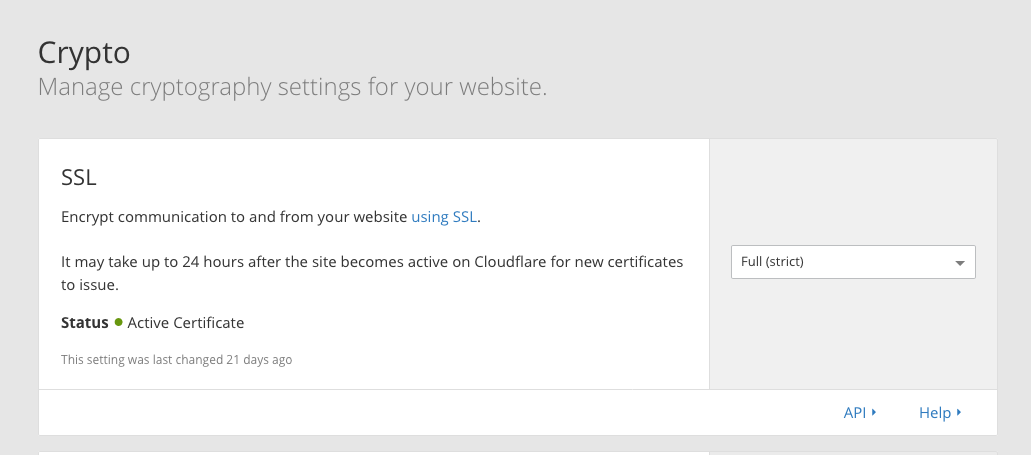 Under the "Crypto" tab, set SSL to Full (Strict)