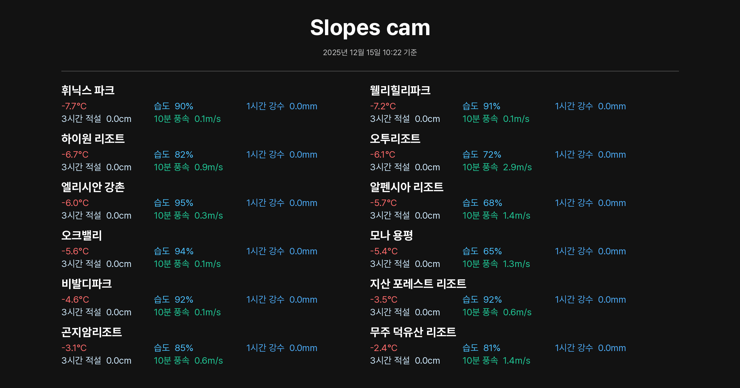 - 전국 스키장의 실시간 날씨 정보를 제공합니다.