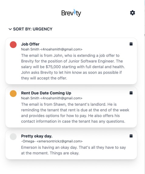 Brevity is a chrome extension that programmatically ranks your emails based on their urgency and importance. Additionally, Brevity provides a short summary of each email, captured by only a few sentences.