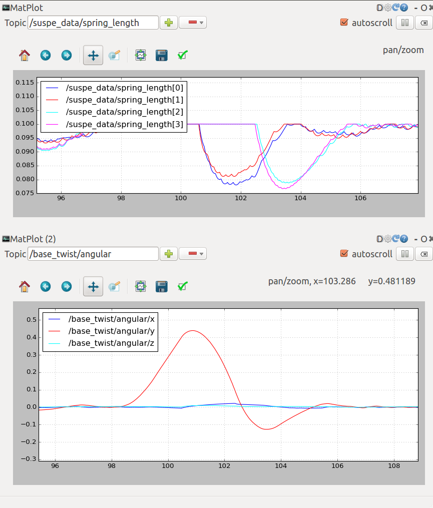 There are two rqt_plot on the right of the interface, you can choose several variables of the robot and dispaly it in curve form. The two most useful variables are spring_length and the base_twist/angular. For example, you can judge whether the spring stroke is exhausted by observing the curve of the spring_length, base_twist/angular could tell you the pose of the robot. You can scale the curve by holding down the right mouse button in rqt_plot.