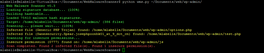 python wms.py /path/to/web/installations/OWASP Web Malware Scanner uses a community-driven malware signature database to detect malwares. Signatures are found under the signatures/ folder. Each signature must be a text file, that contains the following JSON object: