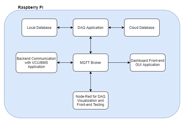 What this means is that the different applications running on the pi don't need to know about each other, an application will publish a message to a topic and the broker will check what applications are subscribed to that topic and serve them with the message. It is event driven meaning you don't need your application to be waiting for a message, it can be operating normally and when it receives a message, it will momentarily pause, process the message, and go back to regular operation. In our software system, it is the main method of communication between the different applications ie. front-end is subscribed to vehicleSpeed, VCU back-end will receive a message from the microcontroller indicating a speed and will publish a message to vehicleSpeed.