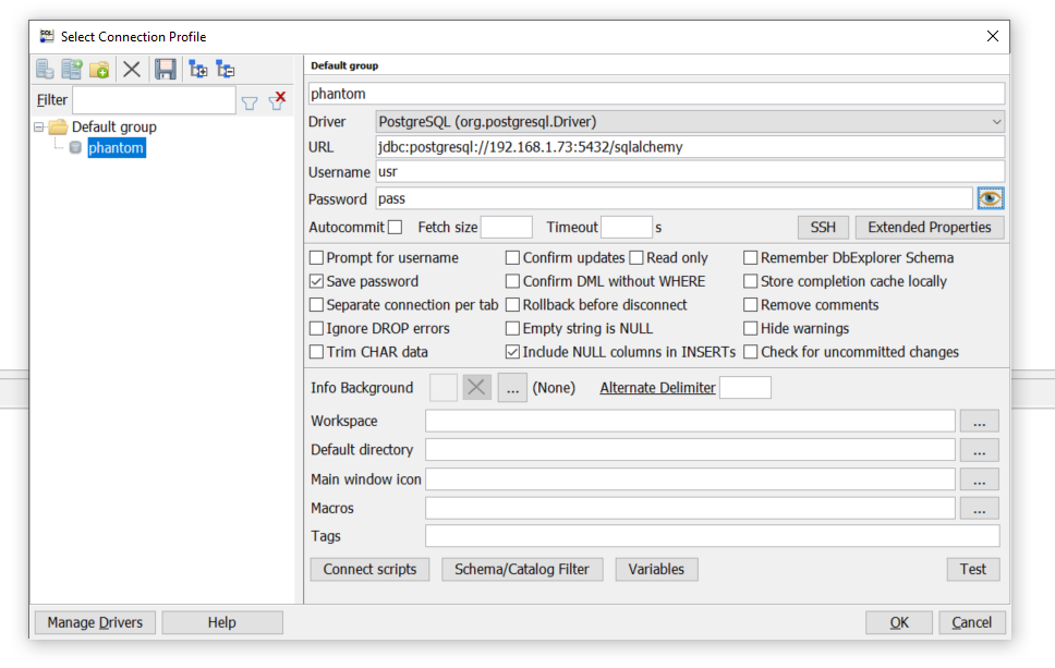 SQLAlchemy was used in python to define the table structure and perform queries on the database. The main script would now subscribe to the MQTT topics and await messages containing sensor data to be recorded. SQLWorkbench(https://www.sql-workbench.eu/Workbench-Build127-with-optional-libs.zip) is used to connect to the database and the postgreSQL database driver can be downloaded here https://jdbc.postgresql.org/download.html.