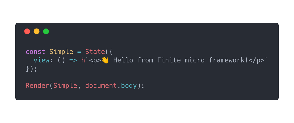 Finite.Render(JustText, document.body);const Counter = Finite.State({