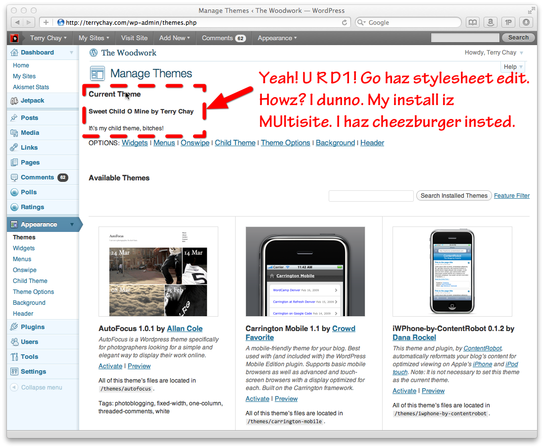 The problem many run into is currently the only way to child theme something is edit files on the filesystem. This is non-intuitive for shared-hosting sites with one-click WordPress installs (it usually involves a “shell account” or learning how to use FTP).